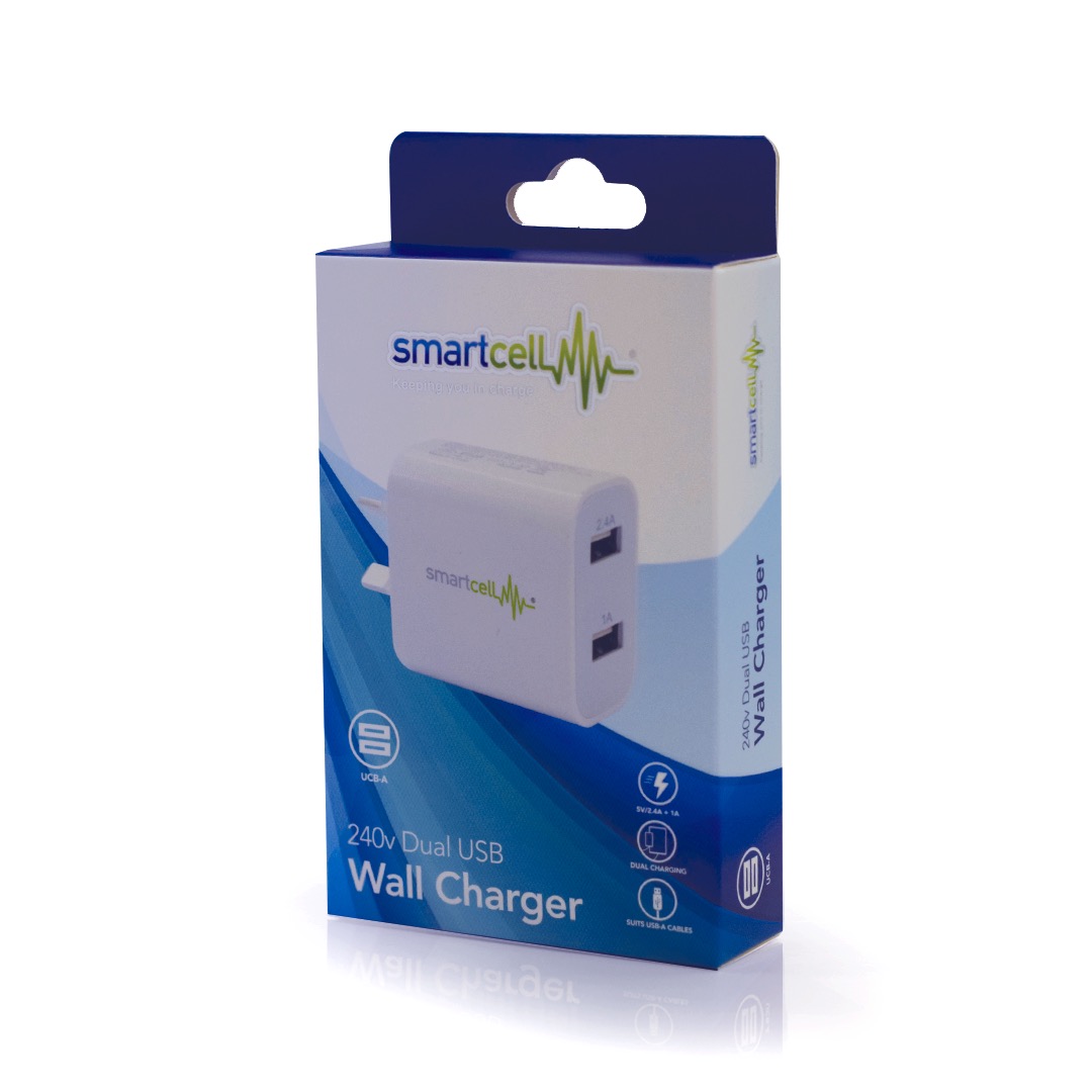The Smartcell 240v Dual USB Wall Charger is a dual USB wall charger that provides charging for a range of devices, so you can get your devices up to speed quickly. This charger works with a wide range of smartphones and tablets including Apple, Google and Samsung.