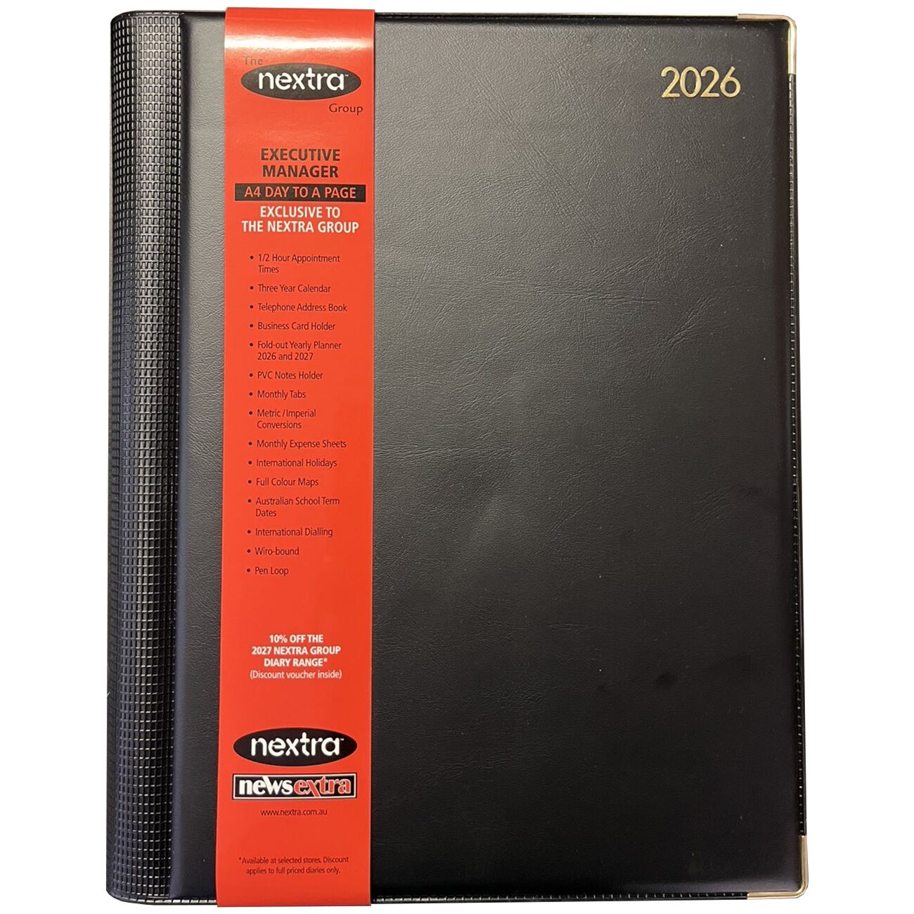 Nextra 2026 Diary A4 DTP – Exclusive Collins Debden Edition Stay organised and plan your year in style with the exclusive Nextra 2026 Diary A4 DTP, published by Collins Debden. Designed for busy professionals, students, and home organisers alike, this diary combines practical features with a sleek, durable design to help you manage appointments, notes, and important dates efficiently throughout 2026. With a spacious A4 size (297 x 210mm) and day-to-page (DTP) format, the diary provides plenty of room for writing, making it ideal for desk use while remaining practical for daily planning. Its thoughtfully designed features make it an essential tool for personal, business, or school organisation. Key Features: 12-month diary (January – December 2026) Day-to-page (DTP) layout with appointment times Three-year calendar and fold-out yearly planners Telephone address book and business card holder Notes holder and monthly tabs for easy navigation Metric conversions and monthly expense tracker International holidays, Australian school term dates, and international dialling codes Full-colour maps for reference Wiro-bound with durable cover and pen loop Perfect for home, office, or school, the Nextra 2026 Diary A4 DTP keeps you organised and on top of your schedule all year long.