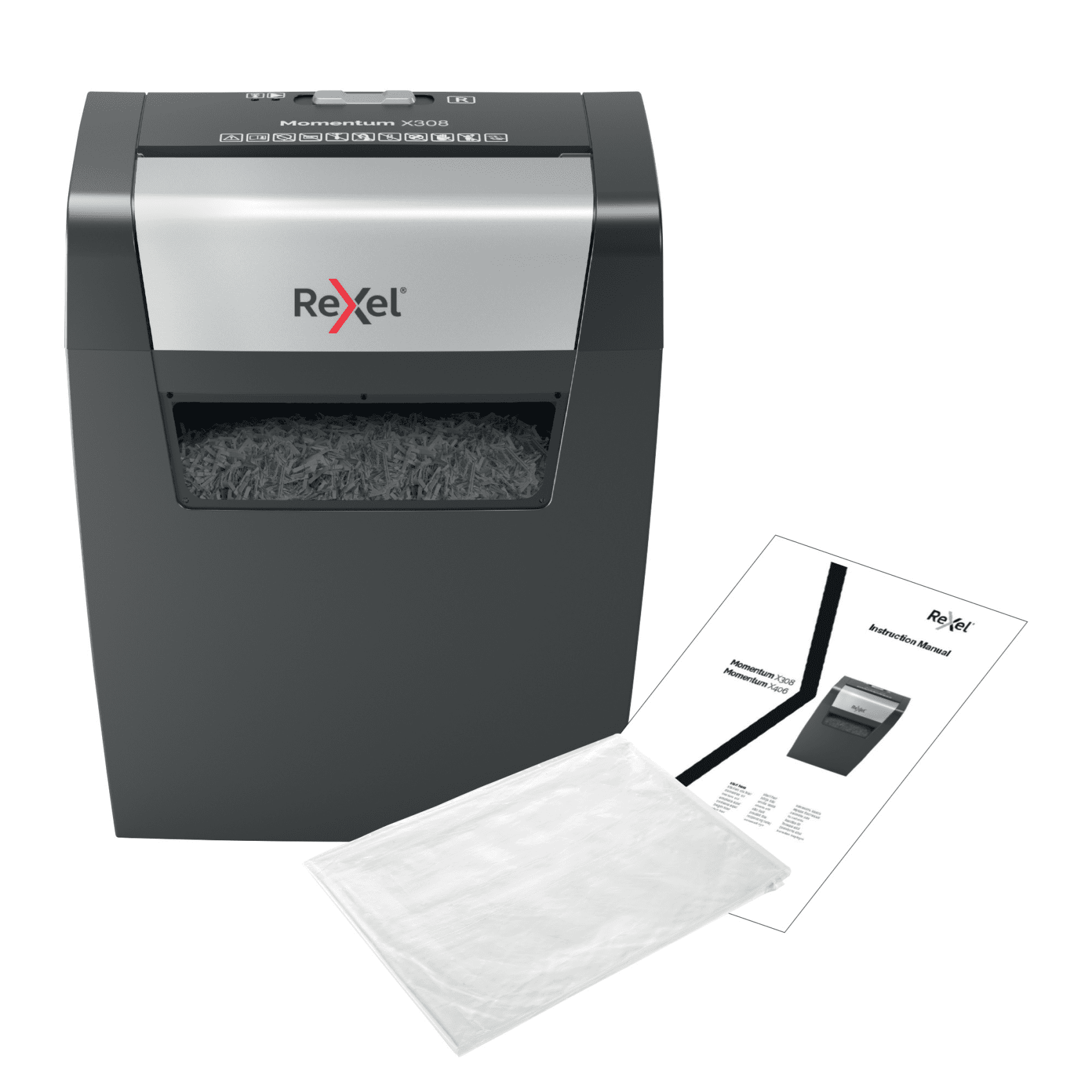 The power to shred more! The Rexel Momentum X308 Paper Shredder shreds up to 8 sheets in one go, with a 3 minute continuous run time, making it ideal for home use. P3, Cross Cut 5×42mm pieces. 15L bin capacity (100 A4 sheets).
